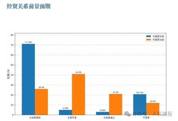 调查显示,尽管两国民众都认识到双边关系发展存在挑战,但普遍将深化经济合作视为两国关系发展的重要方向,展现出较强的经济合作意愿。印度受访者尤其对中印经济合作能带来的机会充满期待。