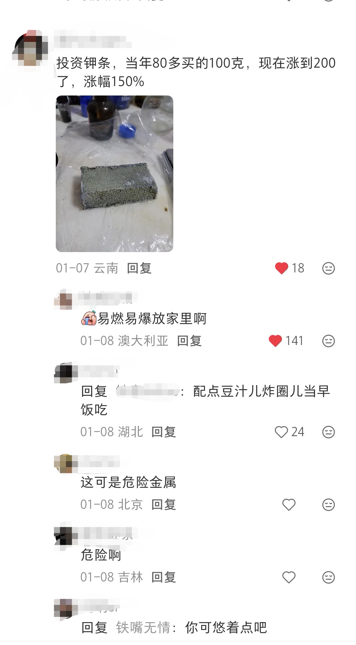 热潮之下,也有网友将目光投向更小众的品种。有人晒出“投资钾条”的经历,声称当年80多元买入的100克钾条,如今市价已涨到200元,涨幅超过100%。不过这条分享也引来其他网友的提醒,“钾可是危险金属”“放在家里易燃易爆,风险太大了”。